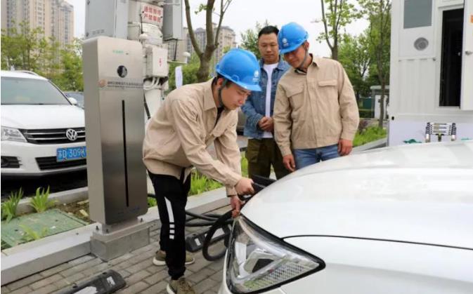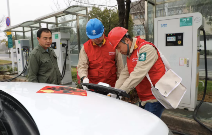 ▲国网江苏溧阳供电公司工作人员为电动车车主提供充电服务