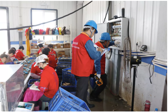 ▲国网山东乳山供电公司员工为南黄岛村牡蛎包装车间提供服务
