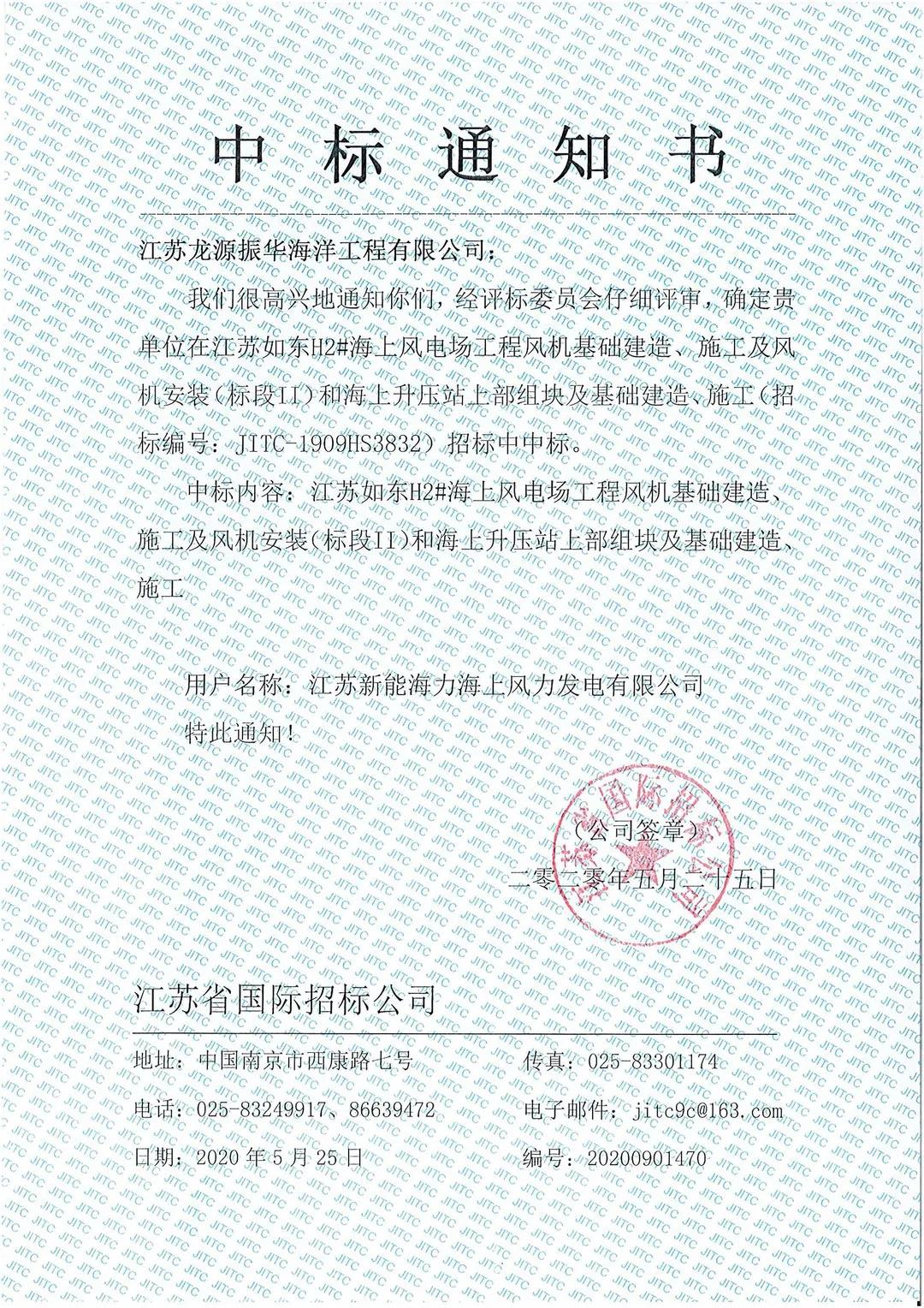 5月25日,江苏省国际招标公司发来喜讯,龙源振华成功中标江苏如东H2#海上风电场工程风机基础建造、施工及风机安装(标段II)和海上升压站上部组块及基础建造、施工项目。