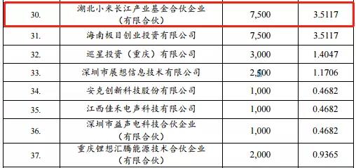 10月14日,赣锋锂业(002460.SZ)发布《关于控股子公司赣锋锂电增资扩股事宜的进展公告》。公告显示,湖北小米长江产业基金合伙企业(有限合伙)是赣锋锂电的第30大股东,认缴注册资本7500万元,持股比例3.5117%。