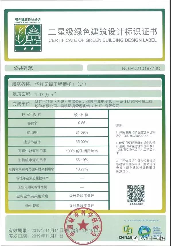 另外,十一科技在华虹无锡项目工程师楼(E1)设计和建造中坚持绿色与节能理念,加大创新力度和新材料、新设备、新技术的推广运用,倡导低碳环保,最终凭借100%的生活热水的可再生能源利用率,65%的建筑节能率,56.19%的非传统水源利用率等一系列靓丽的绿色与节能指标,获得中国城市科学研究院认证的“二星级绿色建筑设计标识证书”。
