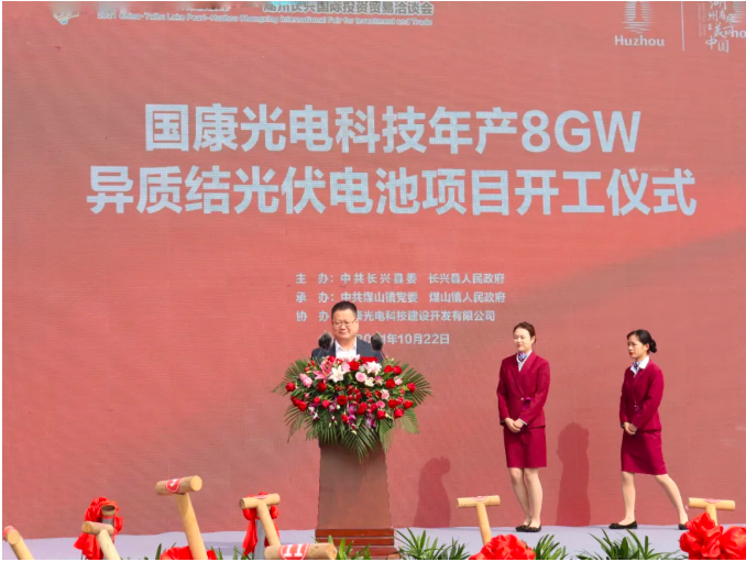 10月22日上午,爱康科技国康光电年产8GW异质结光伏电池项目在国家级(长兴)绿色制造产业园举行了盛大的开工仪式。长兴县委副书记、县长沈志伟,煤山镇党委书记郎涛,浙能产业园公司董事长谢伟,爱康企管集团董事长邹承慧等长兴县、乡镇领导和企业嘉宾出席了项目的开工仪式并为项目奠基。