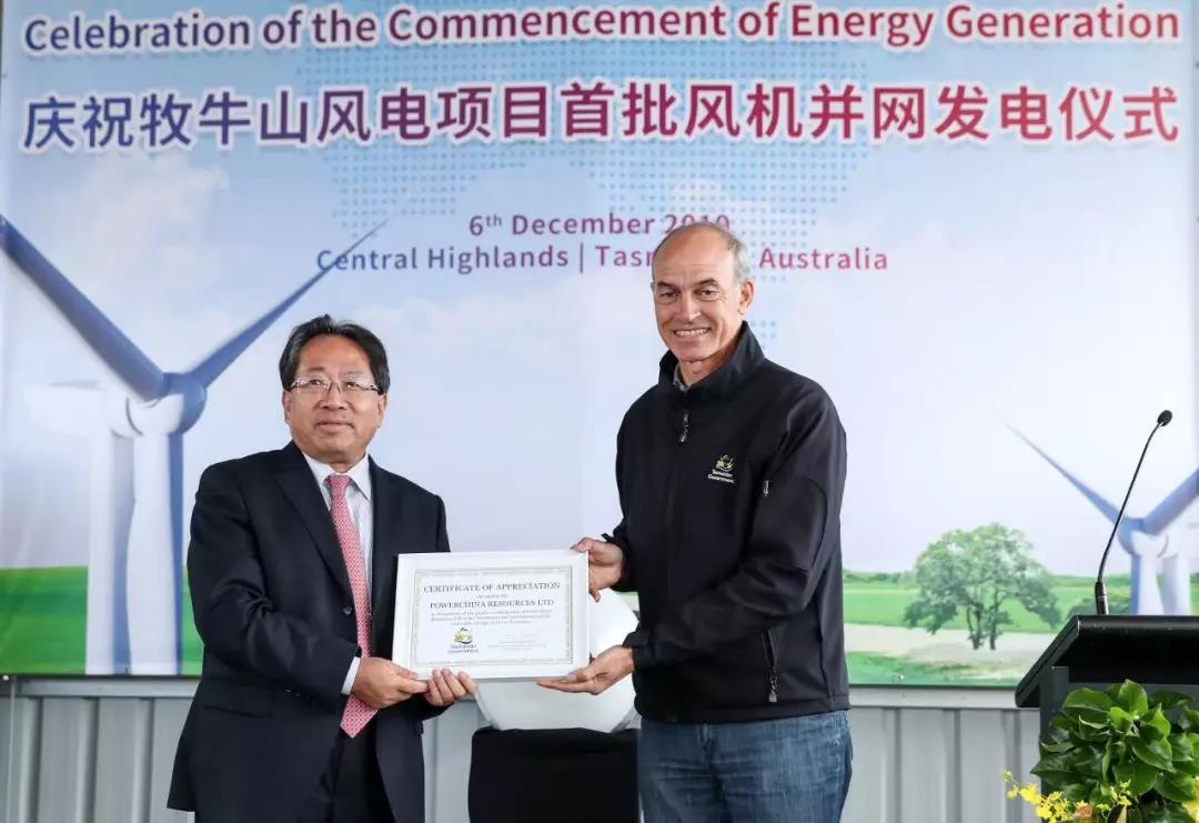 值得一提的是,Cattle Hill风电场项目将帮助塔斯马尼亚政府进一步实现其可再生能源目标,即到2022年底,岛上可再生能源发电能力再增加1000亿千瓦时,占所需新增发电量的一半左右。这个被当地政府视为“改变州运”的重大项目是实现澳大利亚可再生能源年发电量突破330亿千瓦时目标的里程碑工程。在此次庆祝仪式上,塔斯马尼亚州能源部长盖伊·巴奈特,代表塔州政府为项目颁发了“嘉奖状”。他指出,该项目的顺利实施进一步增强了澳大利亚政府继续推动可再生能源发展的信心,也为塔州政府2022年全面实现100%可再生能源自给自足的目标和打造“国家电池”的计划作出巨大贡献。