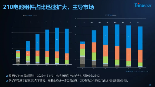 在今年国内大型企业定标项目中,高功率组件占比83%,市场同步向好。今年初,各大逆变器厂商也纷纷拿出匹配或兼容210超高功率组件的交付方案,600W+光伏开放创新生态联盟持续扩大。据相关机构预测,随着生态进一步完善成熟,210电池组件的应用占比将加速超过50%,主导市场。
