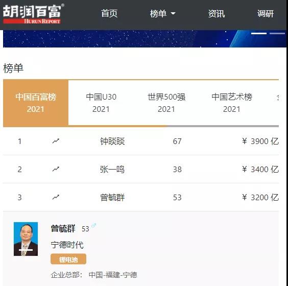 10月27日,胡润研究院发布《胡润百富榜》,宁德时代董事长曾毓群身价3200亿成中国第三大富豪。