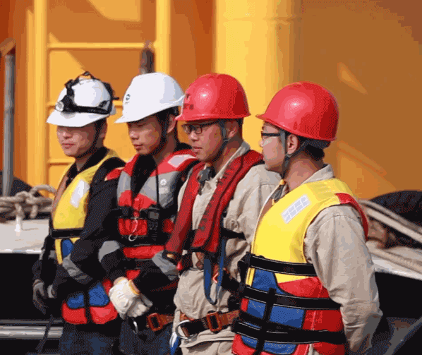 △工作人员正在进行海上作业,汗水浸透了工作服。