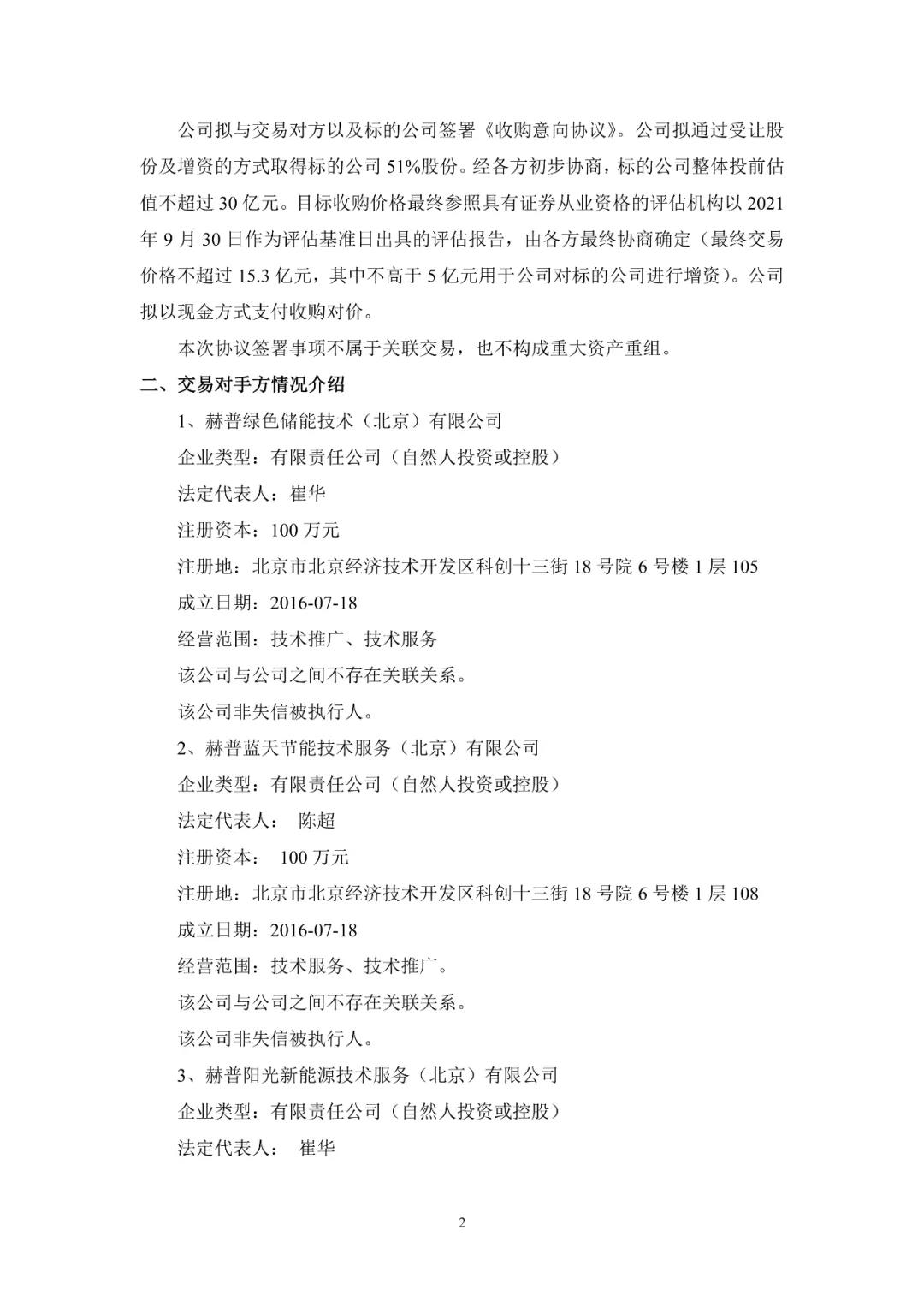 11月7日,杭锅股份发布公告,公司拟与交易对方以及赫普能源环境科技股份有限公司(简称“标的公司”或“赫普能源”)签署《收购意向协议》。交易对方合计持有标的公司90%股份,公司拟通过受让股份及增资的方式取得标的公司51%股份。初步协商标的公司整体投前估值不超过30亿元。目标收购价格最终参照具有证券从业资格的评估机构以2021年9月30日作为评估基准日出具的评估报告,由各方最终协商确定(最终交易价格不超过15.3亿元,其中不高于5亿元用于公司对标的公司进行增资)。公司拟以现金方式支付收购对价。