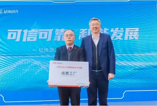 随后,刘金成博士向亿纬动力运营中心副总裁马成勇授牌,授予Q8工厂大型大规模制造技术结晶“成勇工厂”称号。