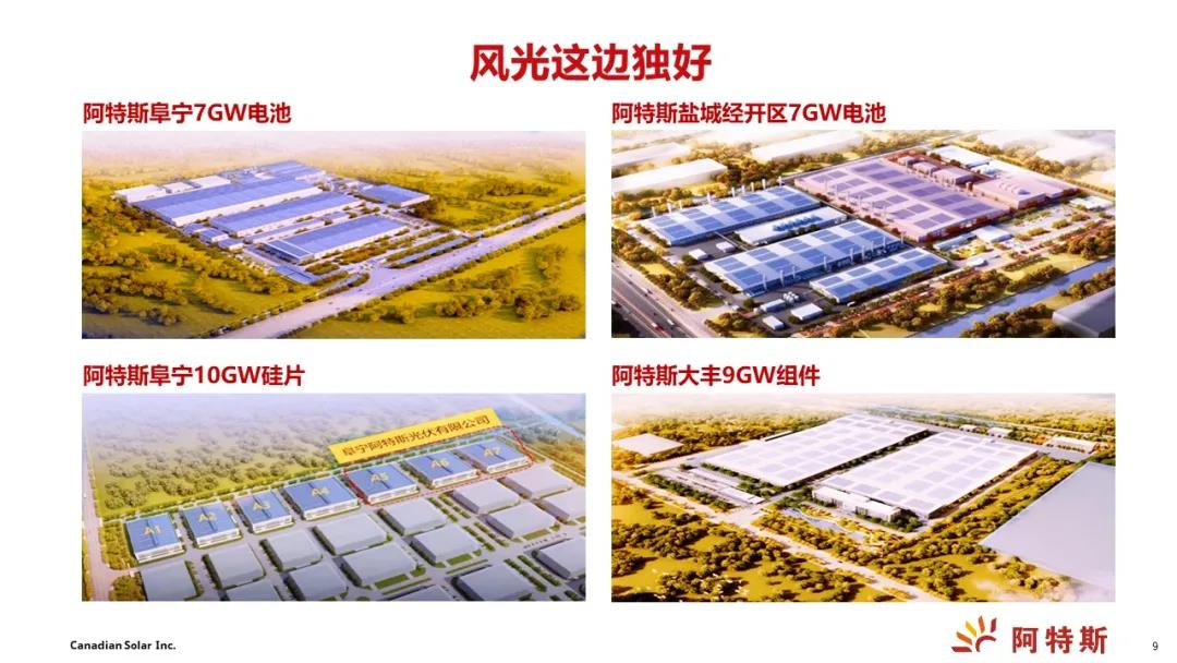2017年,阿特斯向盐城市委市政府提交了“打造盐城千亿光伏产业的规划建议”。为实施这项建议,阿特斯投资建设了图片中的四个工厂基地,达产后年销售收入350亿元,助力盐城实现千亿光伏产业目标。