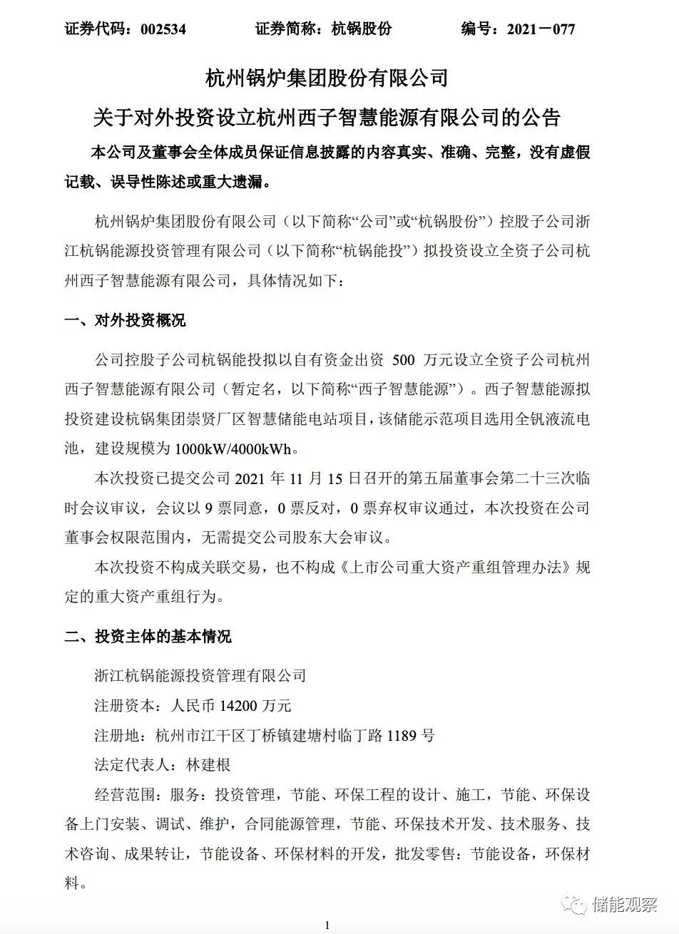 11月16日,杭锅股份晚间公告,公司控股子公司杭锅能投拟以自有资金出资500万元设立全资子公司杭州西子智慧能源有限公司(暂定名,以下简称“西子智慧能源”)。西子智慧能源拟投资建设杭锅集团崇贤厂区智慧储能电站项目,该储能示范项目选用全钒液流电池,建设规模为1000kW/4000kWh。