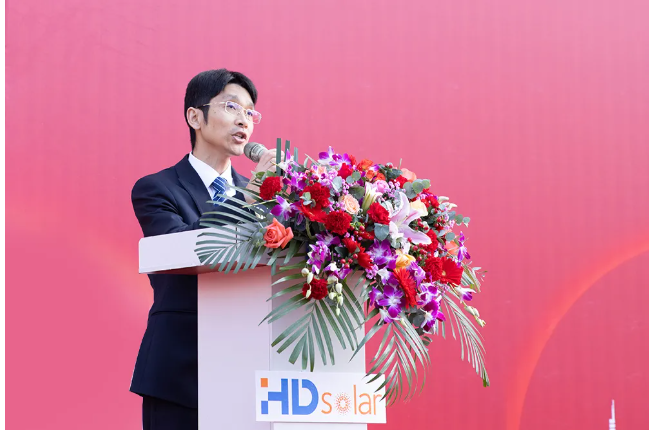董事长朱修锋的致辞拉开了落成仪式的序幕,他首先对关心和支持华鼎新能源发展的各界人士表示衷心地感谢。自成立以来,华鼎新能源深耕光伏支架细分领域,始终坚持“诚信、和谐、高效、创新”的经营理念,以市场为导向,强化技术创新,不断完善光伏支架全产品体系,取得累计装机容量超过10GW,累计专利技术100多项的成绩。今年,更是在光伏跟踪领域首创制动系统,从根本上解决跟踪支架风致共振问题,为光伏电站的安全运行保驾护航。