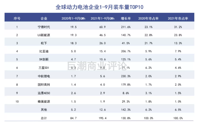 2020年亿纬锂能装机量1.1GWh,市占率仅有1.1%;不过在2021年,凭借和戴姆勒、起亚、小鹏汽车的合作放量,1-9月的动力电池出货量达到0.96GW,市占率到了1.8%。