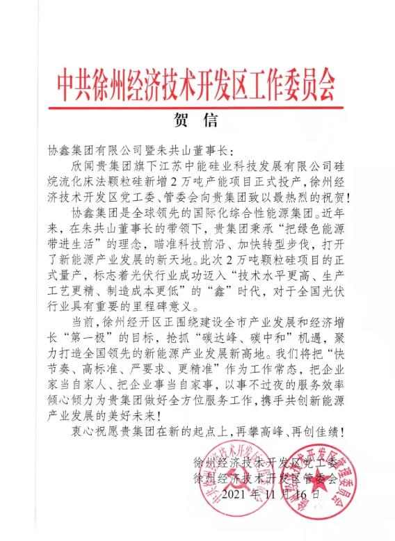 包头市政府在贺信中表示,当前包头正以“建设全国重要的新型材料产业基地和现代能源产业基地,建设在全国有重要影响力的现代装备制造产业基地”为抓手,全力打造一流营商环境。包头市政府将持续为协鑫集团提供全方位、全过程的“包你满意”服务和保障,携手共创新能源产业发展的美好未来。