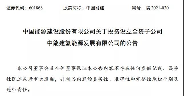 11月26日,中国能建发布公告,为深入贯彻落实中国能源建设股份有限公司《关于全面加强党的领导、加快高质量发展、深化系统改革和加强科学管理的若干意见》,抢抓氢能行业发展的机遇,公司拟设立全资子公司中能建氢能源发展有限公司,总投资50亿元,注册地为北京大兴区。