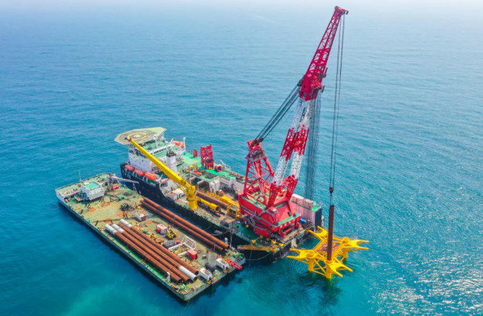 在施工阶段,虽然嵌岩基础数量已有所减少,但由于单个嵌岩基础施工需要近两个月时间,为确保嵌岩施工工期可控,公司与施工单位充分沟通,在基础施工工序、施工工艺上进行大面积的优化。施工单位中铁大桥局通过一次性投入7个嵌岩施工平台同时施工作业;创新性引进了吸力筒加平台架方式设计,加快嵌岩施工平台的倒运;优化灌浆管路设计、采取岸上进行桩内灌浆等方式。随着2020年6月24日项目第一个嵌岩基础WT14顺利完成,整个施工周期比预计缩短了约半个月,既为后续嵌岩基础的实施提供了经验,也极大提升了项目按期完工的信心。值得一提的是,这也是国内首个完工的植入嵌岩三桩导管架风机基础。2021年7月16日,最后一个嵌岩基础WT54植桩顺利完成,宣告了本项目嵌岩基础施工取得圆满成功,为解决海上风电场嵌岩这一世界难题提供了可靠的解决方案,也为国内外需嵌岩施工的海上风场提供了很好的经验借鉴。