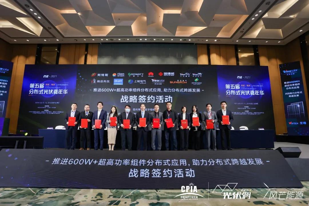 在“双碳”目标和绿色低碳转型的大背景下,提高可再生能源应用比重和提升清洁能源消费比重,成为能源发展的必然趋势。12月初,工信部发布“十四五”最新规划,更是明确鼓励开展屋顶光伏建设,发展大尺寸高效光伏组件!为了进一步推动分布式光伏发展,12月10日,天合光能、天合智慧分布式与全球领先光伏组件企业阿特斯、东方日升、正泰太阳能、以及固德威、古瑞瓦特、华为、锦浪、上能电气、阳光电源和正泰电源7家主流逆变器厂商(按首字母排序),进行了战略签约,联合声明共同推进600W+超高功率组件分布式应用,构建600W+分布式应用体系,推动分布式产业结构高端化、分布式能源消费低碳化转型。