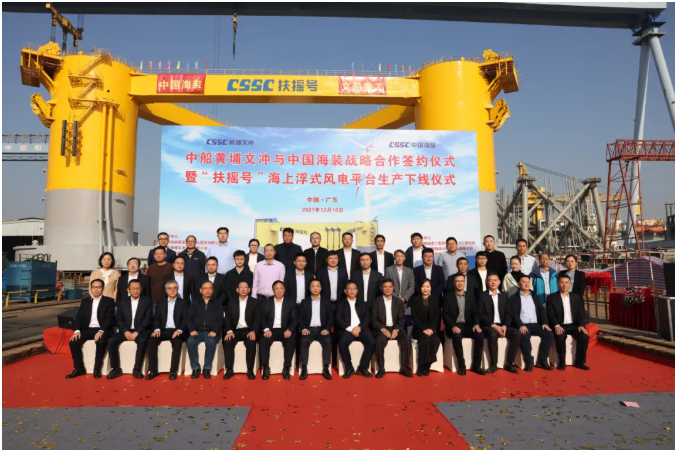 2021年12月10日,由中国船舶集团海装风电股份有限公司(下称中国海装)牵头,联合中国船舶集团内多家成员单位自主研制的“扶摇号”浮式风电机组浮体平台在黄埔文冲成功下线,标志着工信部《海上浮式风电装备研制》项目取得里程碑式的成果,作为中国海装坚定不移实施“创新引领,海陆并举、向海图强”战略的重大科研进展,为我国海上风电走向深远海奠定了坚实基础。