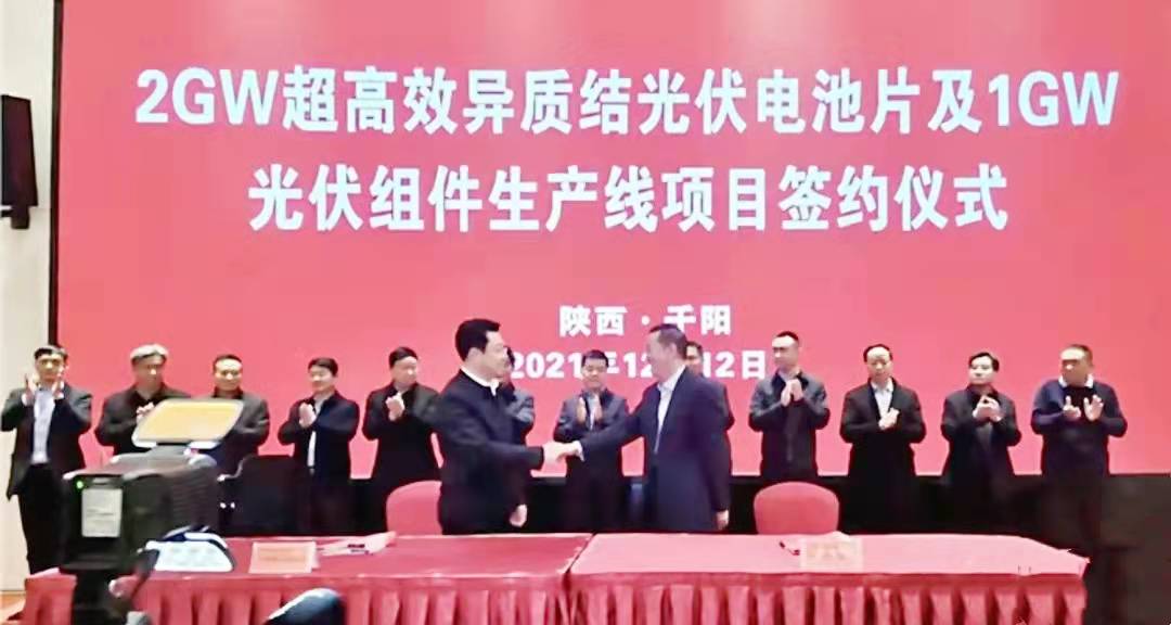 据悉,本次签约项目总占地328亩,签约后将在千阳县环保新材料工业园新材料产业区分两期施工建设。一期计划从2021年12月至2022年12月,投资18亿元,建成1GW超高效异质结光伏电池片生产线、1GW光伏组件生产线,配套生产设备等设施。二期计划在2023年6月至2024年6月,投资9亿元,建成1GW超高效异质结光伏电池片生产线,配套生产设备等设施。