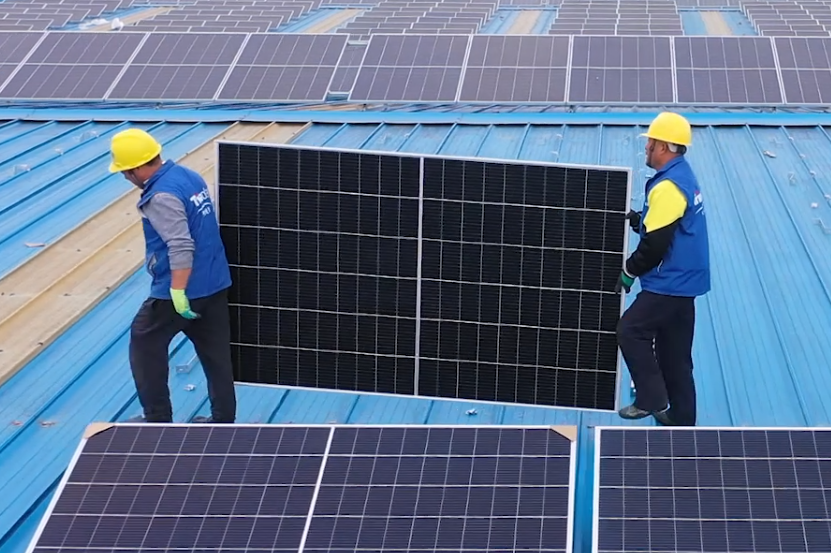在此次项目的厂房屋顶上,天合光能2MW工商业项目仅在20余天内,便已全部安装完毕,装机规模达2MW。所有组件按照屋顶的走向,兼用横装和竖装的方式灵活排布,最大化屋顶利用。在实际的安装过程中,工人两人一组,将组件平稳快速地转运到支架位置,只需十几秒的时间,便可以成功安装好一块超高功率组件。