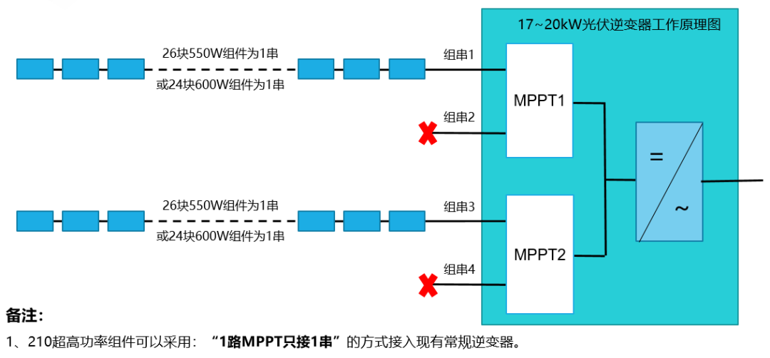 “1路MPPT只接1串”的接线图(图中红色不能接入)