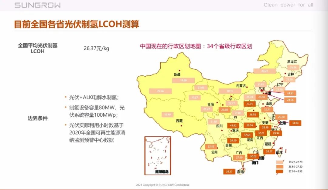 在对应边界条件下,目前全国各省光伏制氢LCOH测算如下