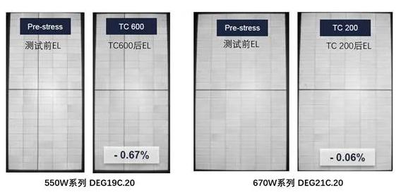 测试结果表明,天合光能至尊超高功率组件拥有卓越的抗击外界温差变化,结构稳定可靠。其中550W系列双玻版型完整测试后未出现一处隐裂,衰减仅为0.67%,670W系列双玻版型测试仍在进行中,已经完成了200次循环,阶段性数据同样优异,未出现一处隐裂,组件近乎0衰减(-0.06%)。