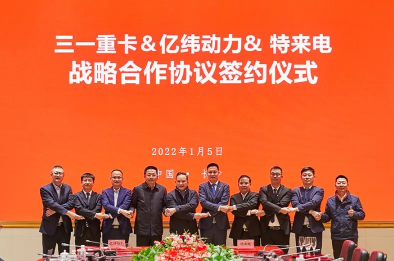 跨入2022年,三一新能源再传喜讯!1月5日,三一重卡与湖北亿纬动力有限公司(以下简称“亿纬动力”)、特来电新能源股份有限公司(以下简称“特来电”)于长沙正式签署战略合作协议,强强联合,共谱2022三一电动重卡战略合作新篇章!