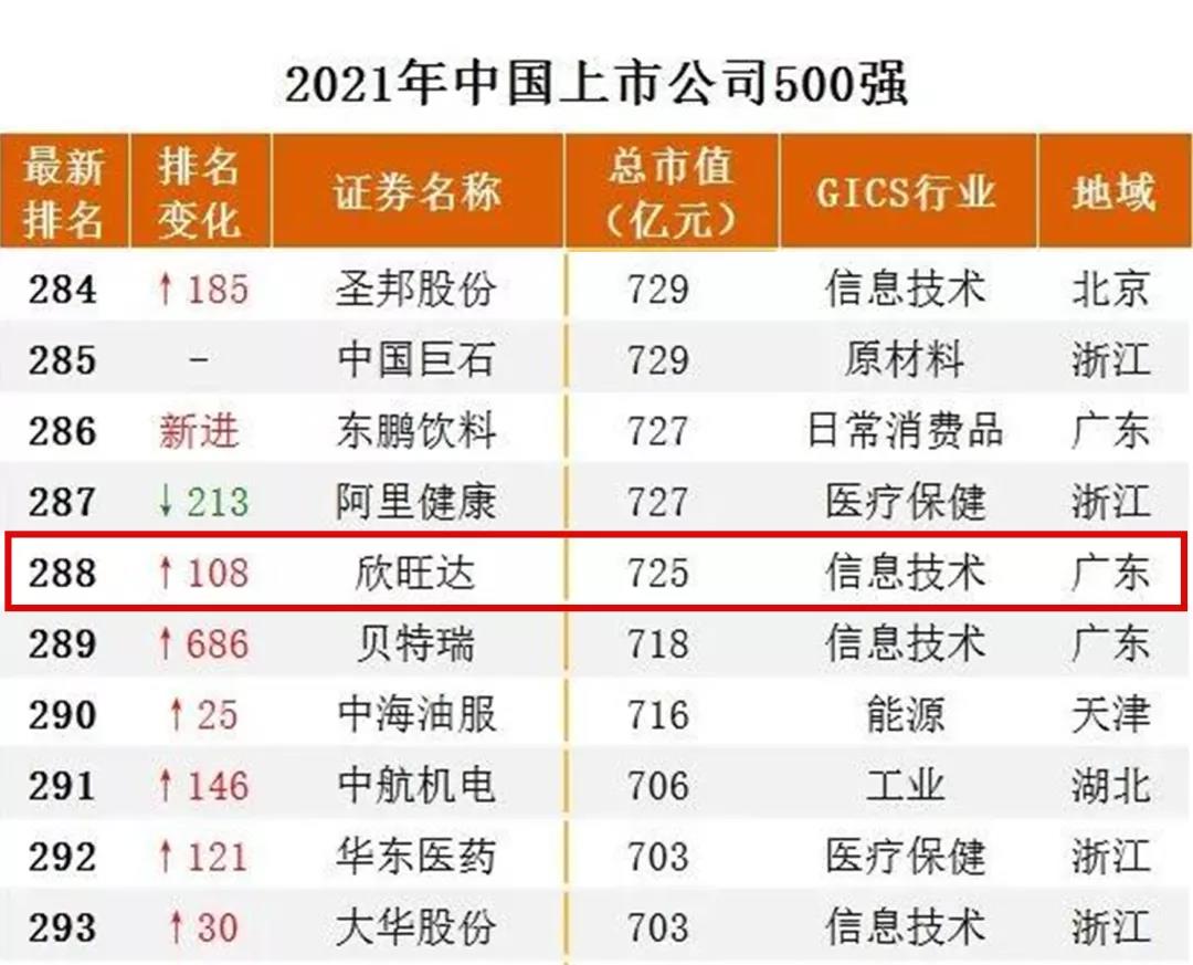 随着2021年股市收官,中国上市公司市值500强榜单也火热出炉。其中欣旺达以总市值725亿元(最高突破900亿元),荣列榜单第288位,较2020年排名上升108位。