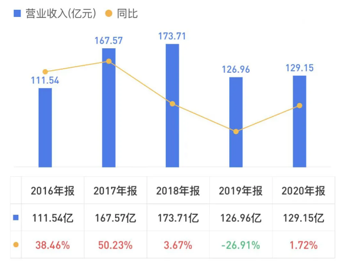 自2017年以来,亿利洁能的业绩增长开始陷入瓶颈。2017年至2020年,营业收入分别为167.57亿元、173.71亿元、126.96亿元、129.15亿元,增长率分别为50.23%、3.68%、-26.91%、1.72%,营收增速断崖式下滑。