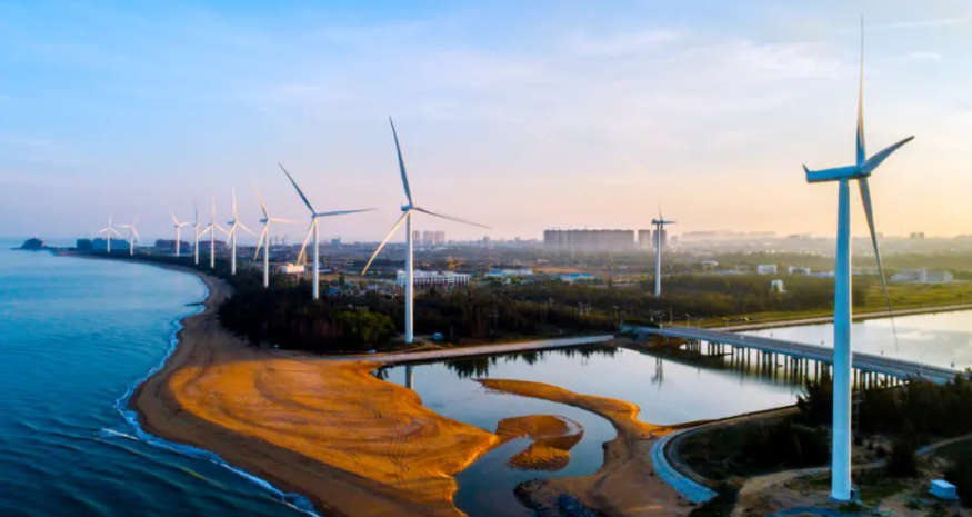 目前,南方电网已全面推进海南新型电力系统建设,服务支撑海南自贸港经济社会发展和碳达峰、碳中和进程。图为位于海南省东方市的风力发电机组。