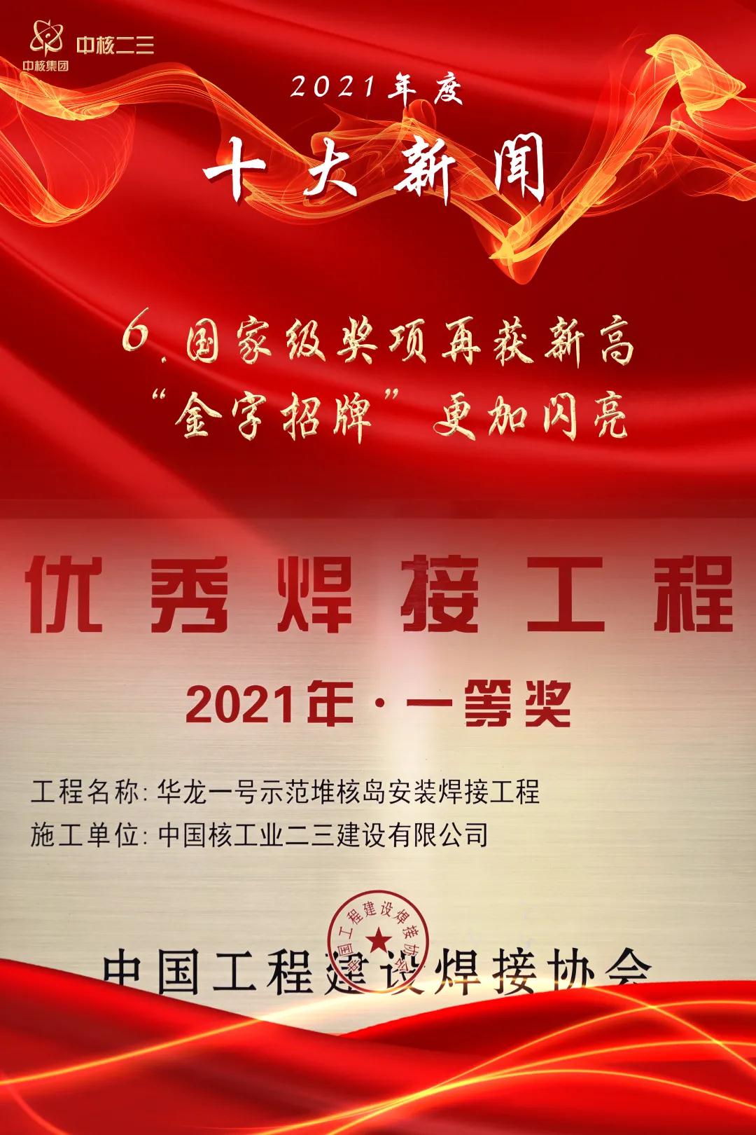 2021年,中核二三承建工程荣获多个国家级重要奖项。其中,“华龙一号”全球首堆福清核电站核岛安装焊接工程、田湾核电站5、6号机组核岛管道焊接工程等4项成果获优秀焊接工程一等奖。陕西延长中煤榆林能化工一期启动项目填平补齐工程甲醇联合装置2线焊接工程、红沿河核电站4号机组燃料传输管道焊接工程等3项成果获优秀焊接工程优秀奖。同时,5项QC小组获得国家级QC小组活动优秀成果,13家所属单位共计50项QC小组荣获省部级QC小组活动优秀成果,公司还获评“全国建筑业AAA级信用企业”称号。高技能人才脱颖而出,未晓朋、陈鸿、胡彪荣获“全国技术能手”称号;权丰宝、李治平等13人获“中核集团技术能手”称号。
