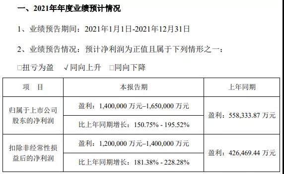 1月27日晚间,宁德时代发布2021年业绩预告。据悉,宁德时代预计,2021年实现净利润为140亿元至165亿元,净利润同比增长150.75%至195.52%。