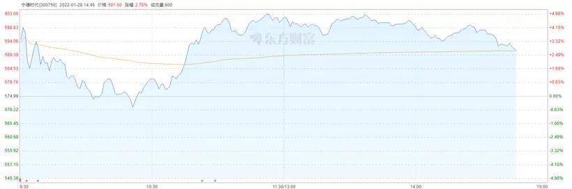 受此利好消息影响,2022年1月28日,宁德时代盘中强势拉升,大涨近5%突破600元大关,市值超14000亿元。