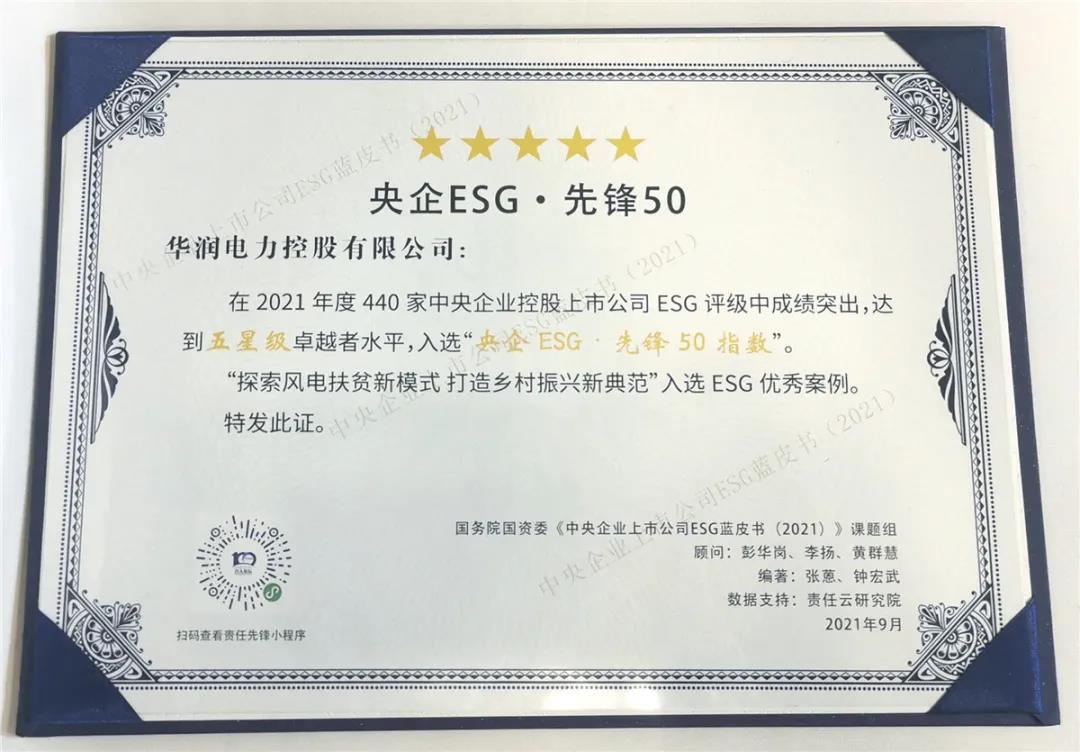 2021年9月18日,由国务院国资委主办、中国社会责任百人论坛承办的“中央企业社会责任报告集中发布活动(2021)”在京举行,活动发布了“央企ESG·先锋50”指数,华润电力在440家参与评级的央企控股上市公司中位列第1名。同时,公司在ESG领域还获得了香港公司2021年ESG卓越奖、低碳创新社会责任企业奖等诸多社会责任类奖项。上述活动彰显了华润电力在环境、社会及企业管治等ESG范畴的卓越表现,反映了资本市场及社会各界对公司可持续发展成效的认可。