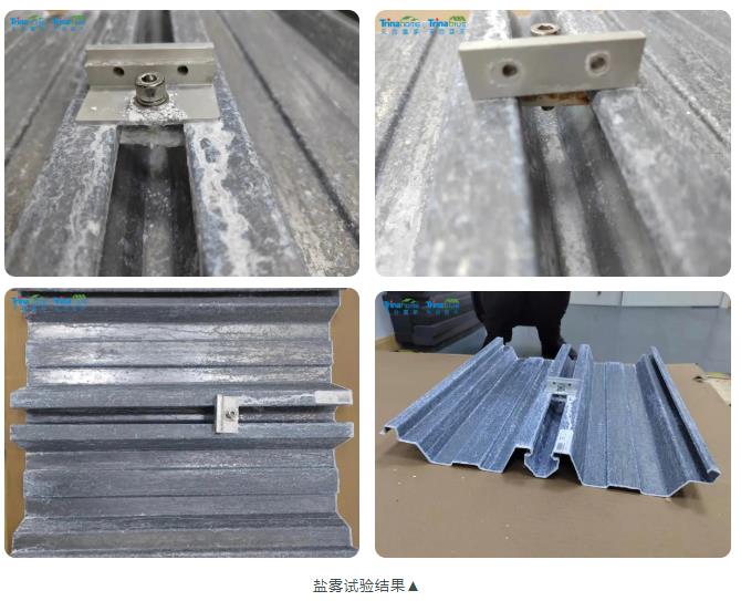 试验小组将天能瓦压型钢板样品放入盐雾试验箱,经过2000小时后将样品取出,发现热镀锌螺母有明显锈蚀,但锌铝镁的压型钢板完全无显示锈蚀痕迹。