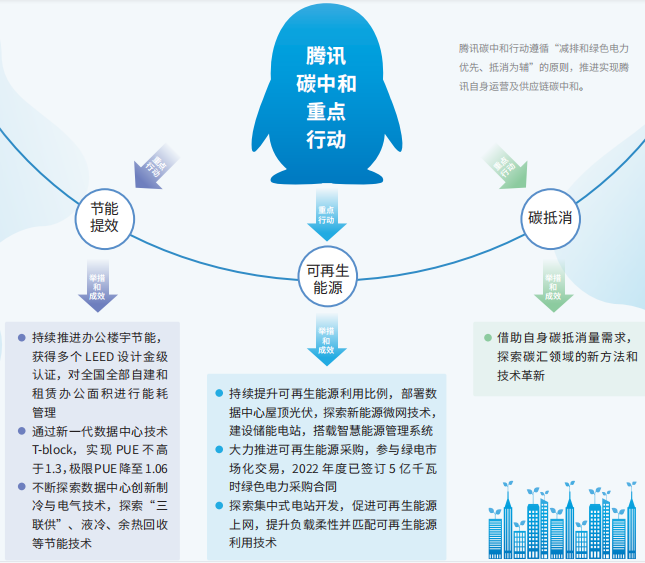腾讯表示其碳中和行动将遵循“减排和绿色电力优先、抵消为辅”的原则,推进实现腾讯自身运营及供应链碳中和。具体共包含节能提效、可再生能源、碳抵消三大行动方向,从节能管理、创新节能技术、提升可再生能源利用比例、推进可再生能源采购和探索碳汇领域的新方法等多方面来实现。