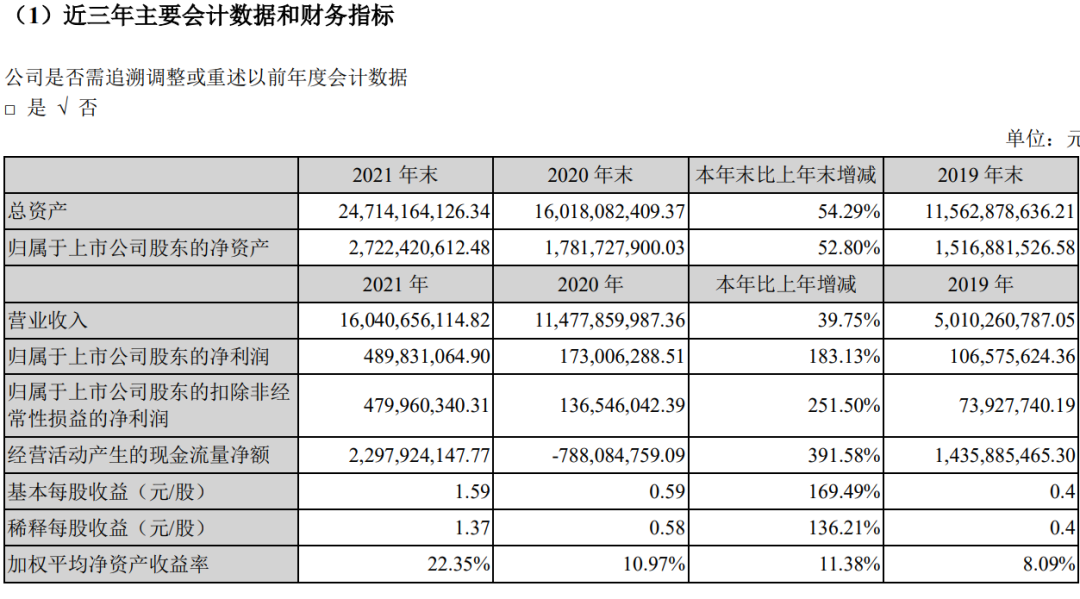 2021年报告期公司实现营收160.41亿元,同比增长39.75%;归母净利润4.9亿元,同比增长183.13%;扣非净利润4.8亿元,同比增长251.5%。基本每股收益1.59元。公司拟向全体股东每10股派发现金红利2.50元(含税),以资本公积金向全体股东每10股转增6股。