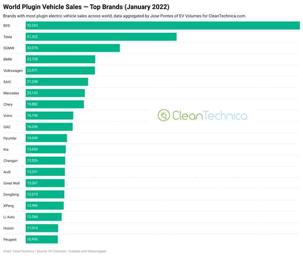 而1月份全球新能源销量榜单中,比亚迪以93,263辆的成绩,大幅领先特斯拉,夺得全球新能源销冠的称号。