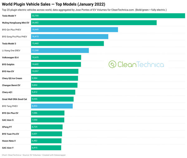 此外,值得一提的是,在2年前,全球新能源销量榜单中,只有两款中国车型上榜,在去年1月份,只有9辆,而在目前,前20阵营中,有17辆中国车型,也难怪该榜单如今已经变成了“中国新能源汽车销量榜”。