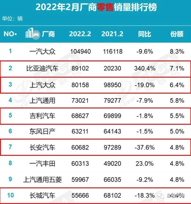 乘联会2022年2月厂商零售销量排行榜显示,比亚迪以89102台,同比劲增340.4%的销量成绩,力压自主三强,第一次戴上自主品牌销量冠军的桂冠。