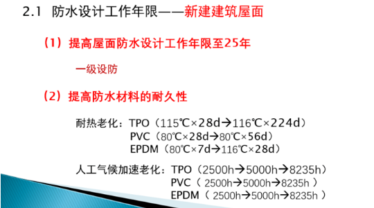 在屋面和防水问题上,张勇总工程师主要探讨了防水设计工作年限(新建建筑屋面和既有建筑屋面)、荷载、固定方式、排水、检修通道等问题: