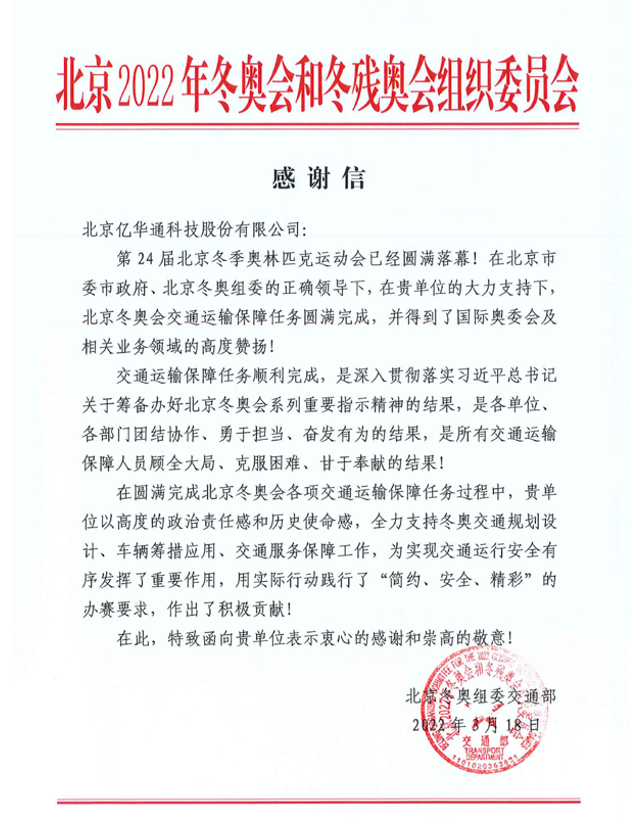 北京2022年冬奥会和冬残奥会组织委员会近日致信感谢亿华通,对亿华通为保障冬(残)奥会交通规划设计、车辆筹措应用、服务保障所作贡献高度赞许,对华通人团结协作、勇于担当、甘于奉献的精神高度认可,并鼓励公司秉承初心,继续砥砺前行,为实现中国产业升级与能源转型贡献氢能力量。
