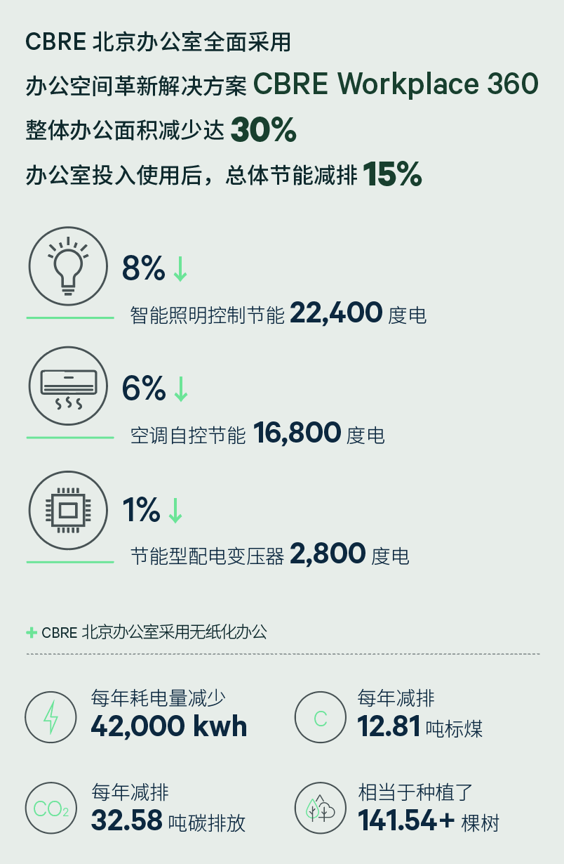 同时,从办公室的方案设计到完工交付、材料选择、施工方式、人员安排等等,CBRE北京办公室都采用了节能减排的方式,致力打造一个完全符合国际最高绿建标准的碳中和办公室。