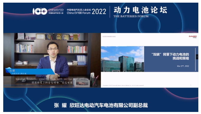 在主题为“下一代电池产业化之路”的动力电池论坛上,欣旺达电动汽车电池副总裁张耀带来《“双碳”背景下动力电池的挑战和策略》的主题演讲。