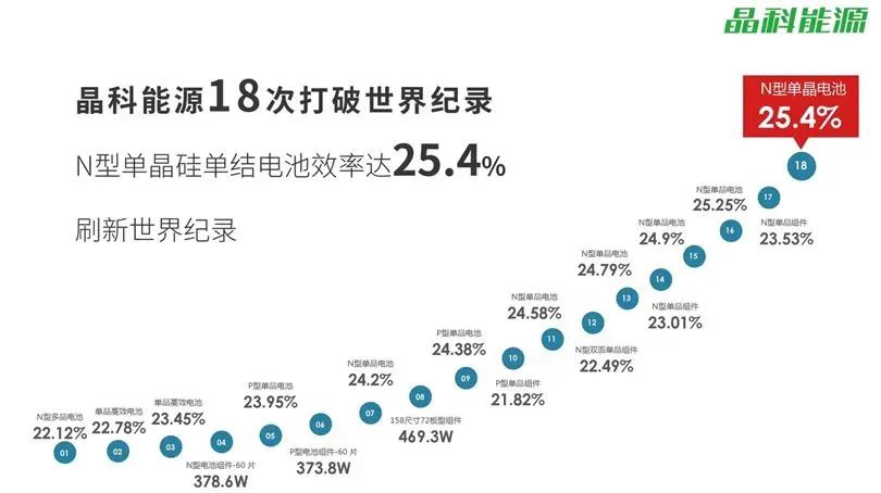 作为技术领先的行业领军企业,晶科能源构建起具有全球竞争力的研发团队,持续探索清洁能源技术革新路径与成果化落地方案。在过去几年中,公司连续18次突破电池片转换效率和组件功率的世界纪录。2021年,晶科能源在一年内四次刷新N型TOPCon电池世界效率的纪录。无论是技术储备,还是商业化推进速度,晶科能源领跑行业。