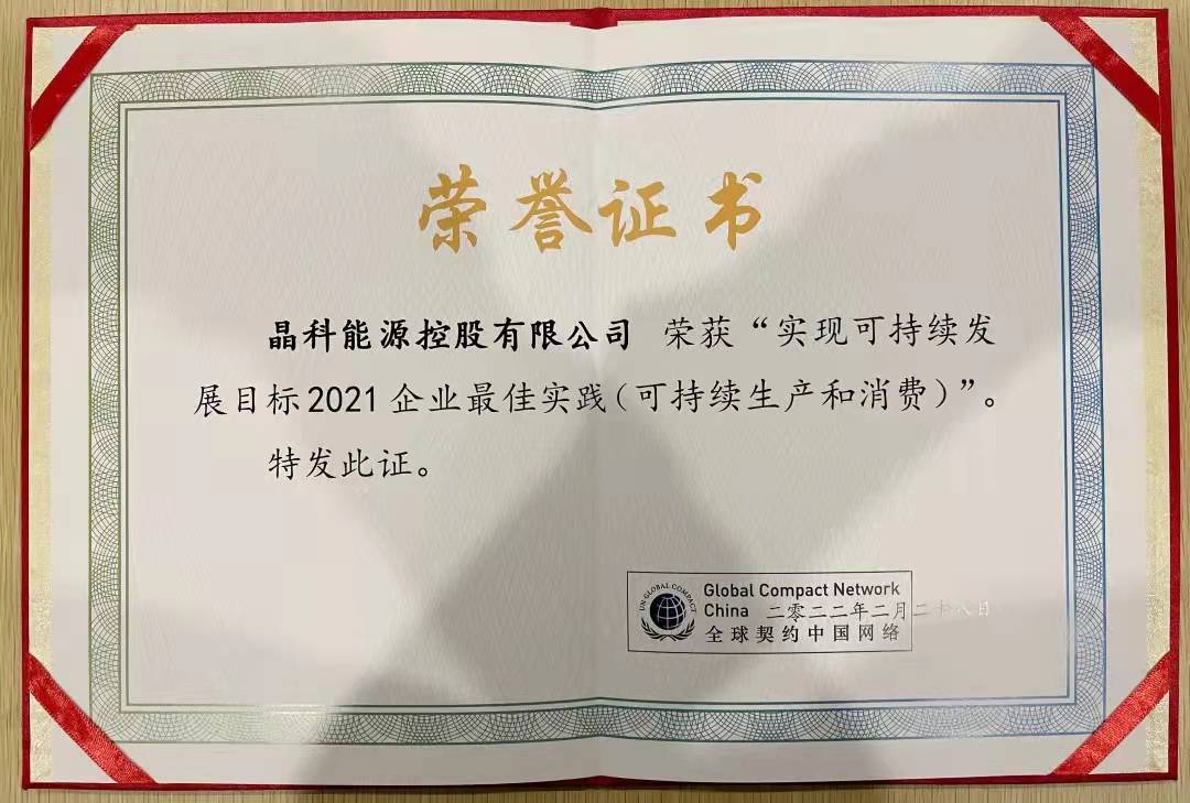 凭借对脱碳事业的砥砺支持,以及优秀的企业运营准则,晶科能源于今年首次入选联合国全球契约中国网络颁发的“实现可持续发展目标2021最佳企业实践”。获此殊荣,表明晶科能源在人权、环境、生产力及透明度四个领域的表现深受认可。