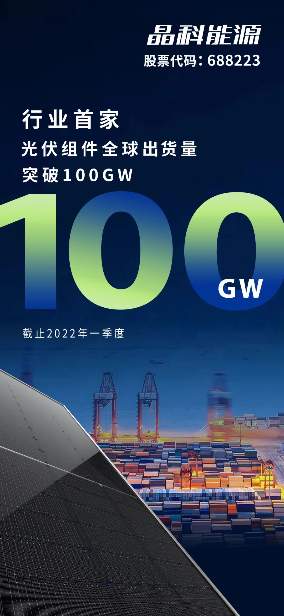 日前,晶科能源宣布,截止2022年第一季度,公司光伏组件全球累计出货量突破100GW。这也是行业首家完成100GW这一里程碑式出货体量的组件制造商。
