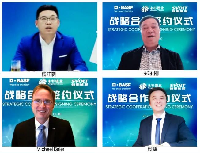 受新冠疫情影响,此次签约采用线上云签约的形式。蜂巢能源董事长兼CEO杨红新、副总裁黄征、全素涵,杉杉控股董事局主席郑永刚,巴斯夫电池材料全球高级副总裁兼巴斯夫杉杉董事长贝铭凯博士(Michael Baier)、巴斯夫杉杉董事总经理杨捷,永杉锂业董事长杨峰等三方高层领导出席了线上签约仪式,见证了协议签署。