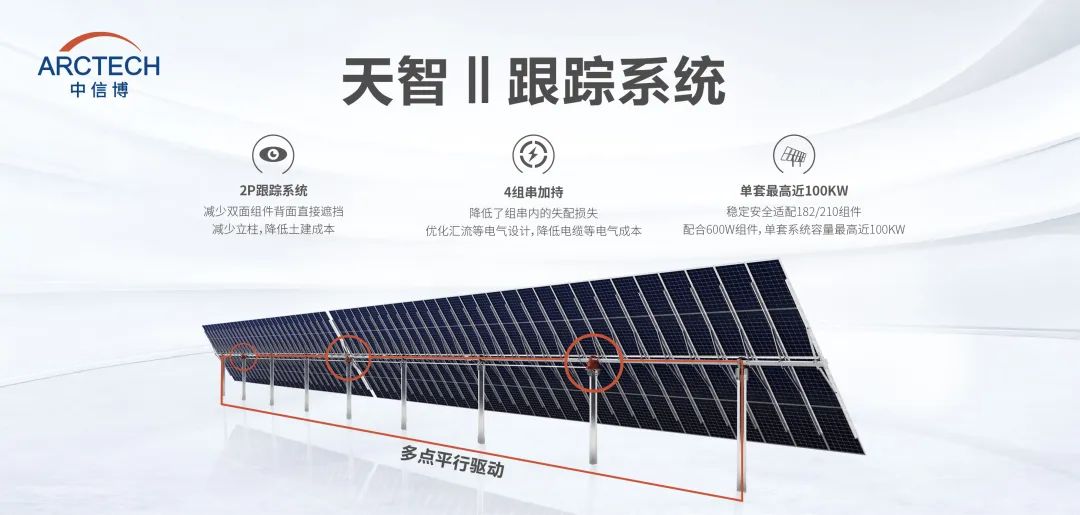 天智II跟踪系统在保证系统稳定性的同时,可配合182/210大组件,将单套系统容量从原先的30KW+带入了90KW+;同时进一步降低了基础数量,比传统单排竖放产品的立柱减少了52%。相比3个组串,天智II跟踪系统具有4个组串的加持,上下组串物理区域分区,降低了组串内的失配损失。
