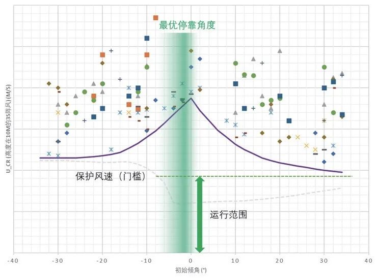 天智II跟踪系统是首个蜗轮蜗杆多点驱动的两排组件竖装的独立跟踪系统,它彻底解决了传统单点固定跟踪器无法在高风速情况下保持空气弹性稳定性的问题。与单点驱动的曲线相反,多点驱动的曲线“向上翻转”,临界风速在各个角度均有提升,这使得天智II跟踪系统的保护风速达到 20m/s。得益于极高的保护风速(或者说更大的运行风速范围),天智II跟踪系统会有更多的跟踪时间,极大地帮助光能的获取。